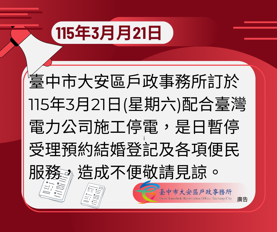115年3月21日(星期六)配合臺灣電力公司施工停電,是日暫停受理預約結婚登記及各項便民服務。 臺中市大安區戶政事務所 2026-03-18 115年3月21日(星期六)配合臺灣電力公司施工停電,是日暫停受理預約結婚登記及各項便民服務,造成不便敬請見諒。