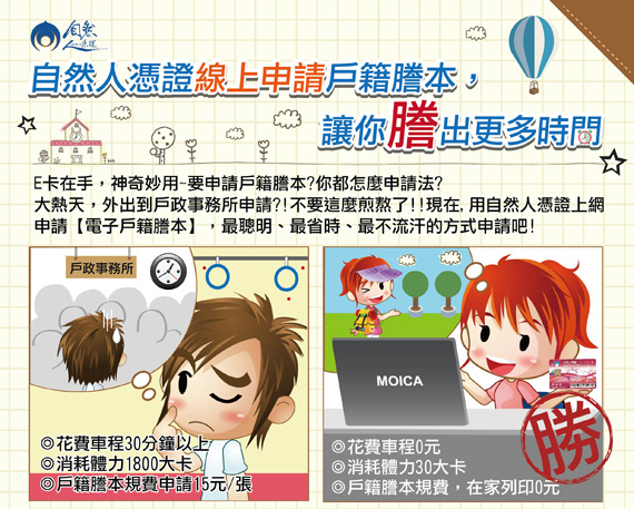 【自然人憑證線上申請戶籍謄本,讓你『謄』出更多時間!】 【自然人憑證線上申請戶籍謄本,讓你『謄』出更多時間!】 網路代替馬路,能少往外面跑還是少跑一趟吧! 現在就告訴您,使用自然人憑證可於內政部戶政司全球資訊網線上免費申辦『現戶全戶』及『現戶部分』電子戶籍謄本,不旦省去到戶所抽號排隊之不便,同時更省下至少15元的申辦費用,且電子戶籍謄本也可自行列印出來,其效力等同於傳統紙本戶籍謄本哦! ※電子戶籍謄本申辦服務※https://www.ris.gov.tw/zh_TW/webapply/16 ※電子戶籍謄本申請教學※http://blog.xuite.net/my_moica/blog/200255722 ※電子戶籍謄本查驗※需用機關(構)收到民眾之電子戶籍謄本時,得於內政部戶政司全球資訊網之「電子戶籍謄本驗證作業」,開啟欲驗證之電子文件檔案,或輸入謄本檢查號查驗,確認該電子戶籍謄本之真實性及有效性。查驗網址:https://www.ris.gov.tw/webapply/185