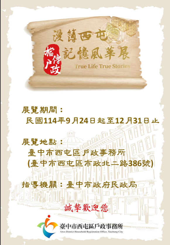 臺中市西屯區戶政事務所於即日起至1141231日舉辦「漫簿西屯.檔傳戶政」記憶風華展,以「走進西屯時光」為出發點,精心規劃5大展區,觀迎前來觀展。