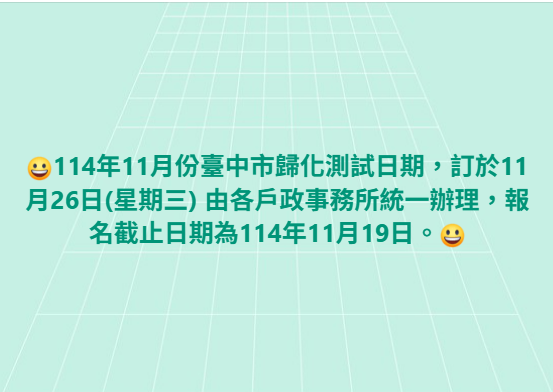 114年11月份臺中市歸化測試日期,訂於11月26日(星期三) 由各戶政事務所統一辦理,報名截止日期為114年11月19日。